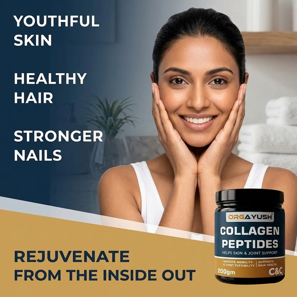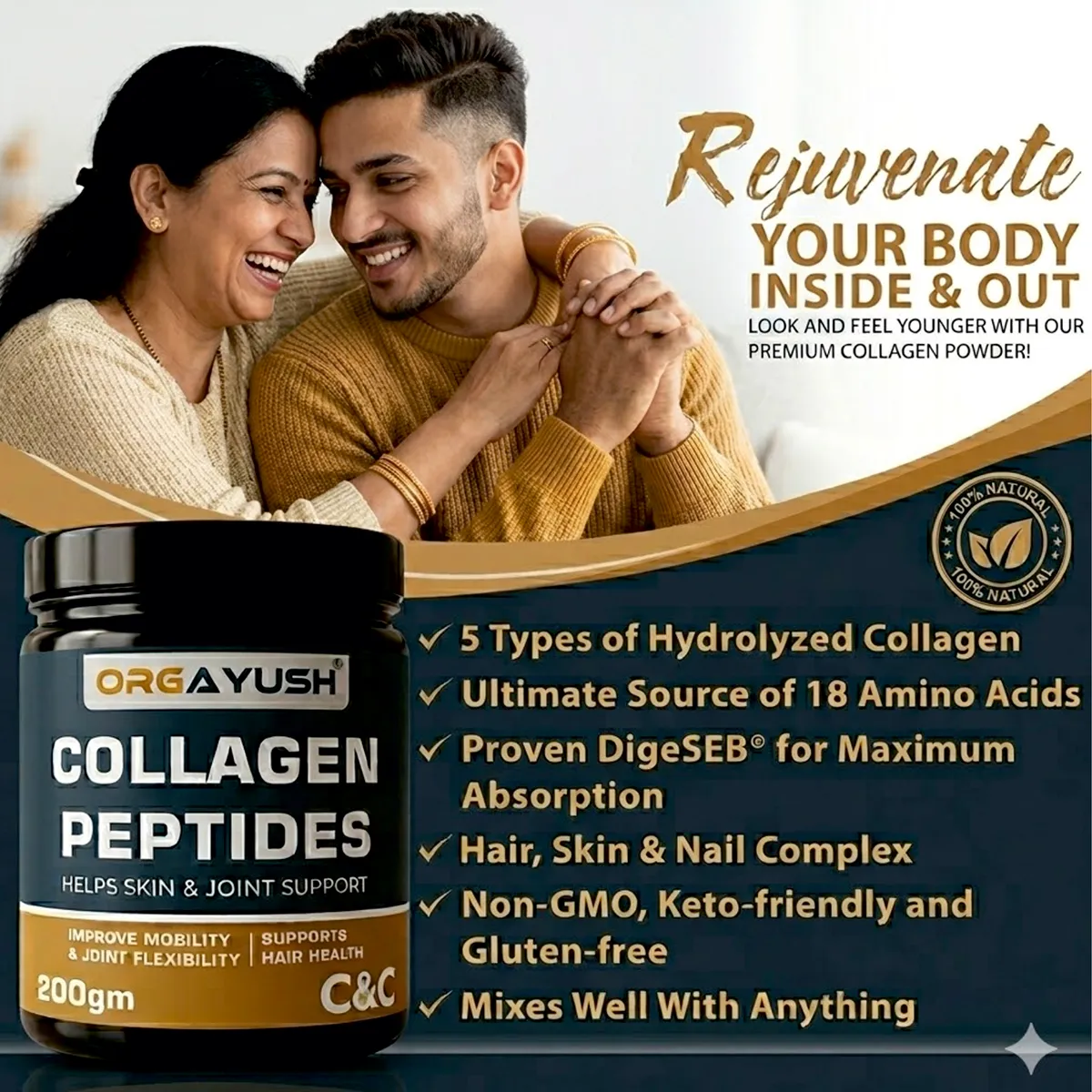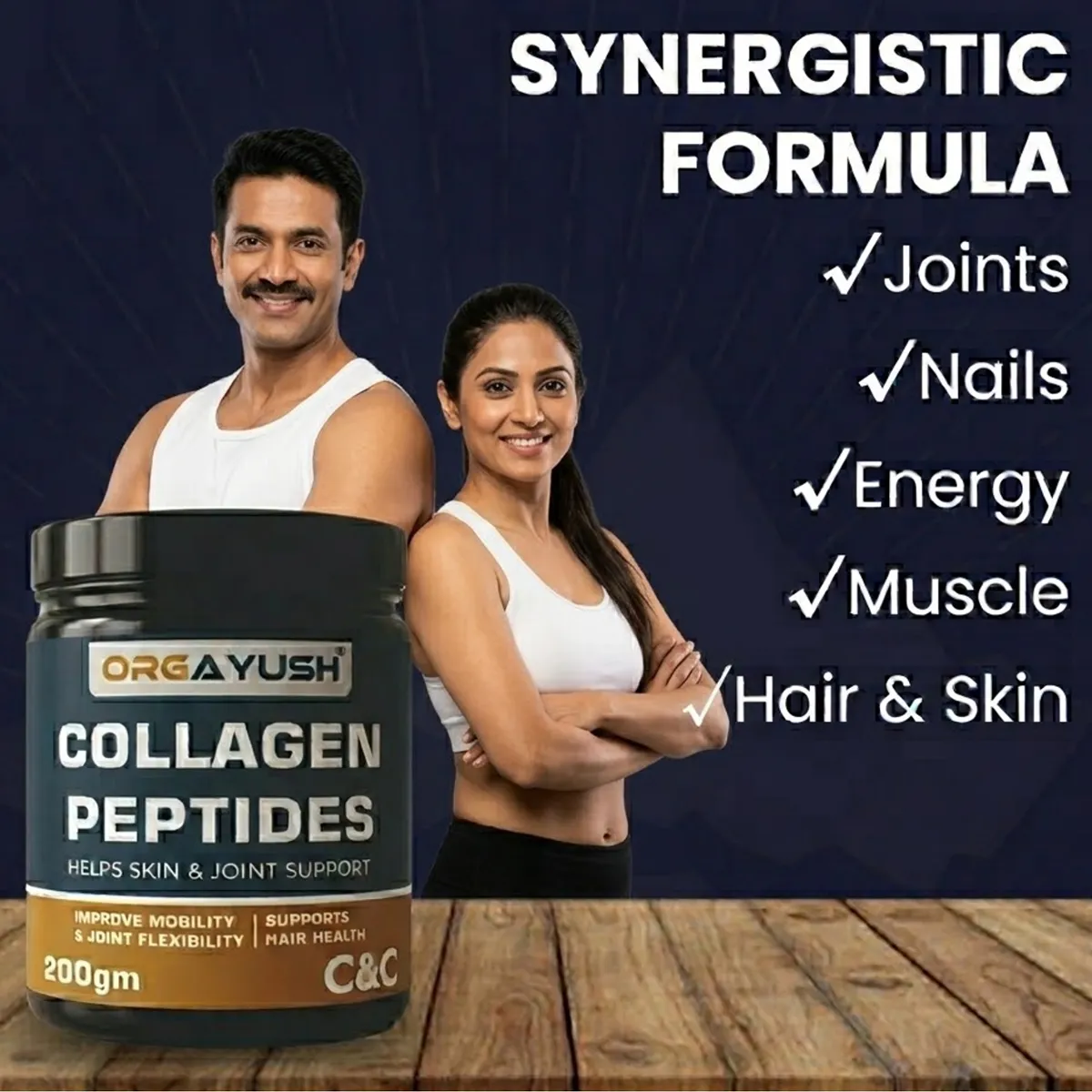 Orgayush Collagen Peptides Powder (200g) is a premium, easy-to-mix supplement designed to support skin elasticity, joint strength, and overall vitality. Formulated with high-quality hydrolyzed collagen peptides, it helps replenish the body’s natural collagen levels that decline with age.