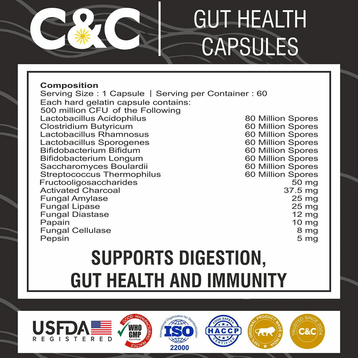 - Bifidobacterium bifidum (60 Million): Supports digestive health