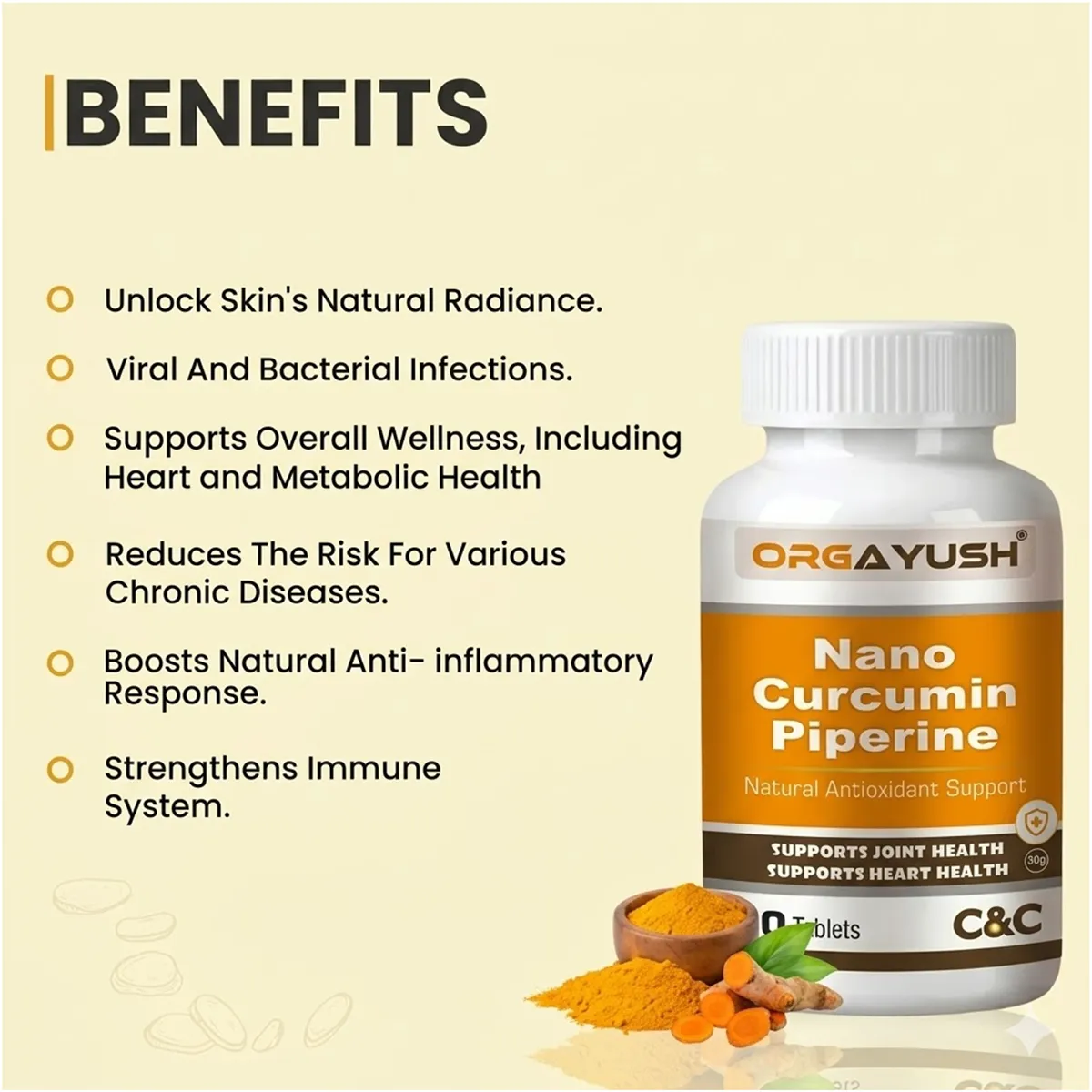 - Curcumin (500 mg): Natural anti-inflammatory & antioxidant