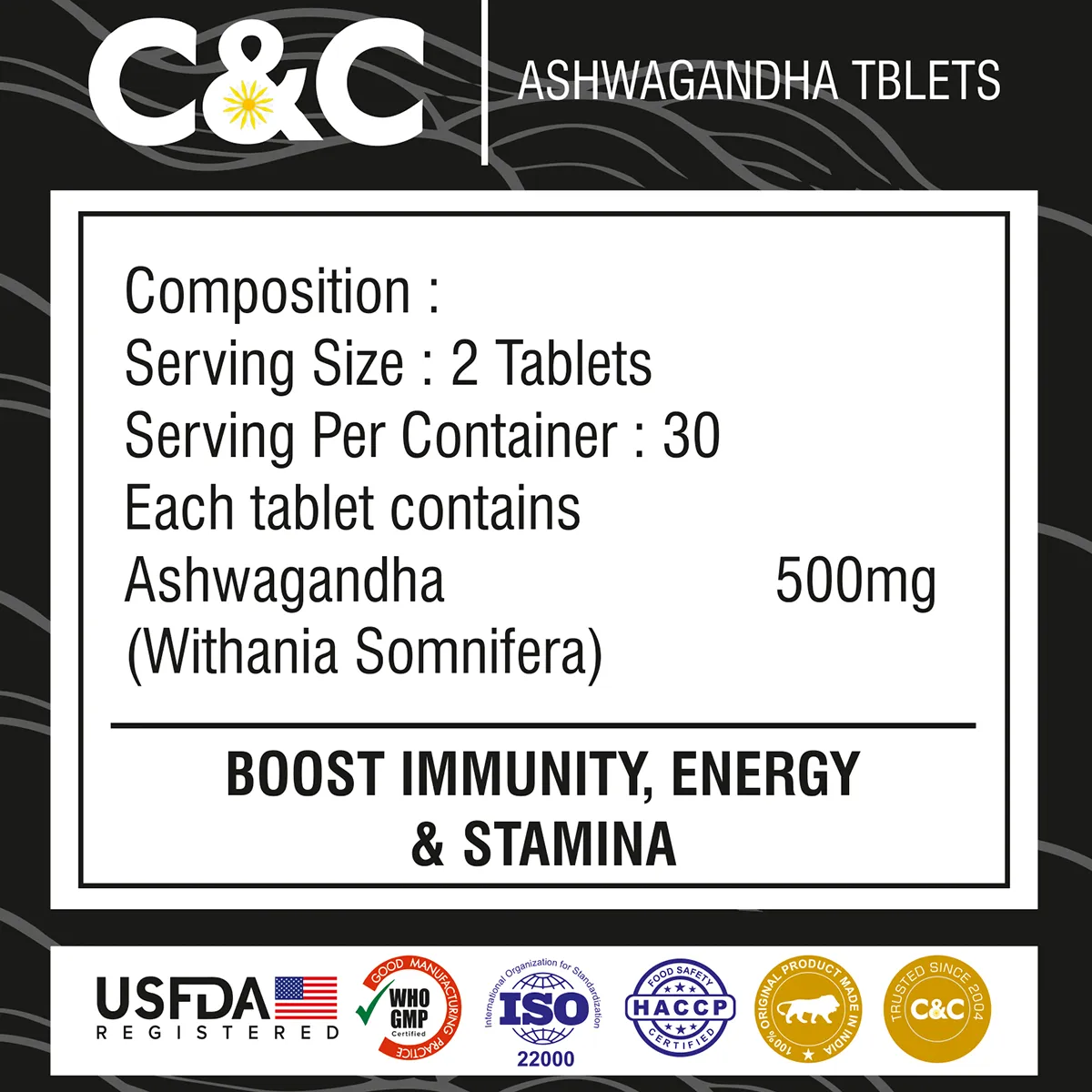 - Ashwagandha (Withania somnifera) – 500 mg per tablet
