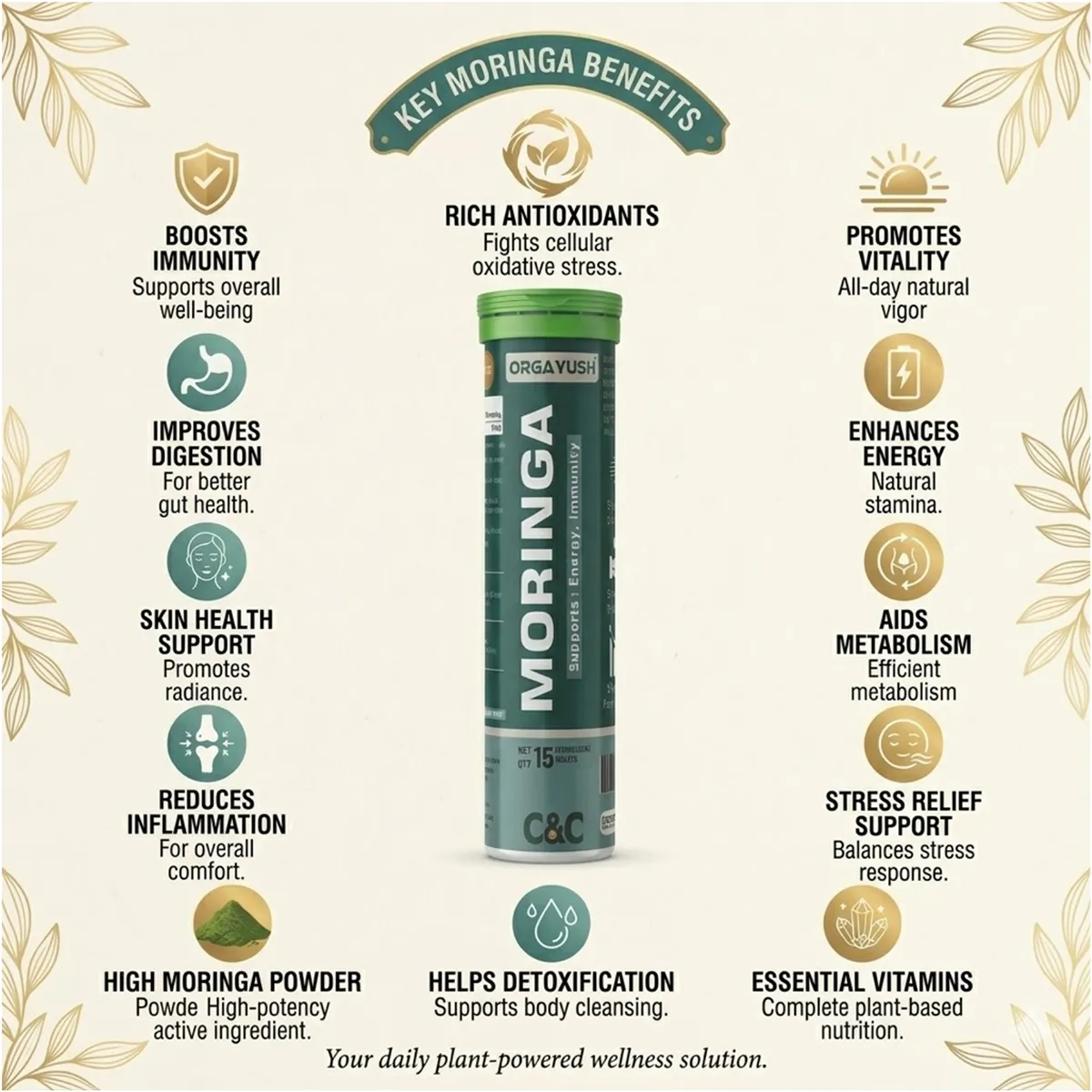 - Organic Moringa (Moringa oleifera): Nutrient-rich superfood supporting energy, immunity, and overall health